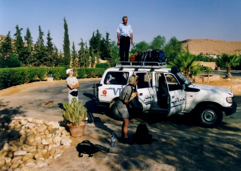 Ab jetzt heißt es beim Aufbrechen erst einmal: Taschen und Rucksäcke aufs Dach! Um möglichst viel Platz im Jeep zu haben, sind inzwischen Schlafsäcke, und alles was sonst unter den Sitzen Platz hatte, im Gepäck verstaut und auf dem Wagendach von Nabil verschnürt.