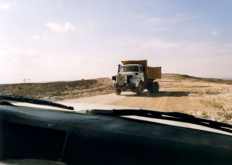 Von Douirat aus geht die Fahrt weiter nach Matmata. Robin war davon ausgegangen, dass wir wieder über Gabès fahren müssten, aber Nabil wusste, dass eine kürzere Straße Metameur und Matmata inzwischen verbindet. Auf diesem Weg waren wir davon nicht immer überzeugt davon. Wir konnten vermutlich alle jemals existierenden Ausbaustufen einer Straße beobachten: von komplett fertig mit Mittelstreifen und Leitpfosten bis zum Schotterweg am Steilhang ohne jegliche Befestigung. Dazwischen lag eine Slalomfahrt um LKWs und Baumaschinen. Aber Nabil hatte Recht, die Strasse war durchgehend (mit dem Jeep) befahrbar.