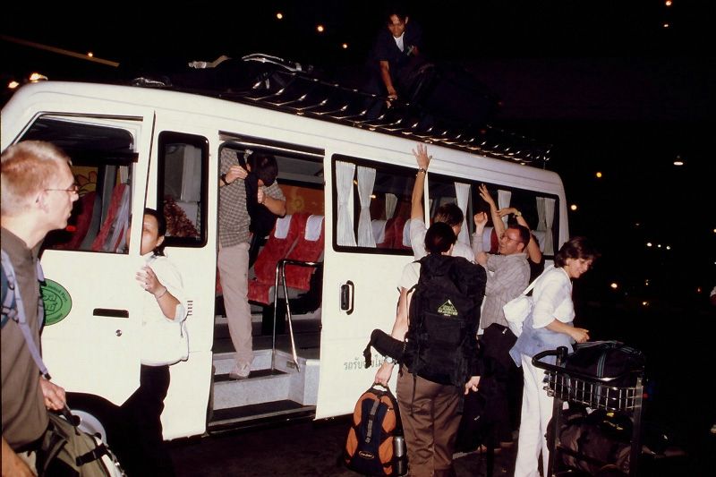 Um 19:25 Uhr Ortszeit landen wir in Bangkok. Nachdem das Gepäck eingesammelt ist - zum Glück ist alles mitgekommen - treffen wir in der Ankunftshalle auf unseren Reisebegleiter Heiko. Bis Chiang Mai wird uns zusätzlich noch eine Thailänderin begleiten, Miss Sompong. In Thailand besteht die Vorschrift, dass jede Reisegruppe einen thailändischen Guide hat. Ein deutscher Reiseleiter würde sonst einem Thai den Arbeitsplatz wegnehmen, und darauf steht Freiheitsstrafe...
