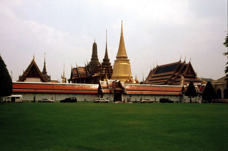 Über den Königsfluss, den Chao Praya, erreichen wir das Ufer ungefähr in Höhe des Königspalastes. Dieses Riesenareal ist wohl die berühmteste Sehenswürdigkeit Bangkoks. Wir hatten es uns zwar schön vorgestellt, aber es ist überwältigend. Alles glänzt und glitzert, soviel Gold auf einem Haufen hatten wir bis dahin noch nicht gesehen!