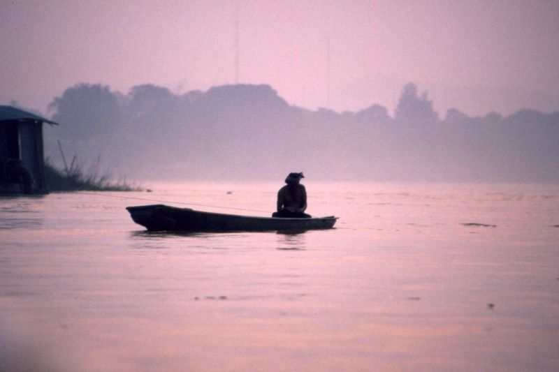 Den Sonnenuntergang wollen wir uns vom Boot aus anschauen. Gemächlich fährt uns der Bootsmann den Mekong rauf, dreht langsam beim Sonnenuntergang und schippert genauso langsam, aber diesmal mit quäkender Musik aus den kleinen Lautsprechern wieder zurück. Eine Stunde Fahrt war ausgemacht, und als wir nach einer Dreiviertelstunde auf den Anleger zusteuern, steht Cheffe dort und rudert mit den Armen, zeigt auf seine Uhr und rudert wieder.