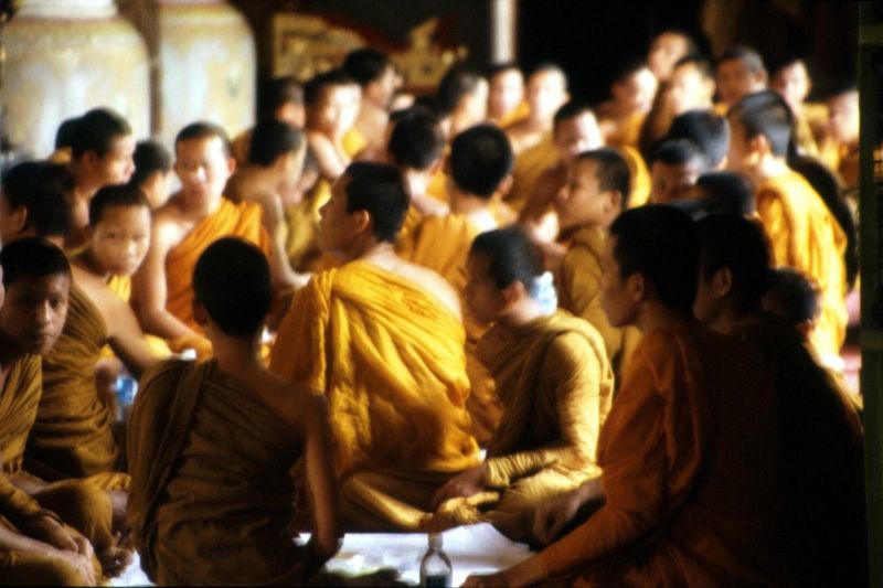 Direkt vor der Ruine des Wat Ched Luang geraten wir in einem großen neueren Tempel gerade zufällig in eine Messe. Schön, heute genug Zeit zu haben, und so bleiben wir so lange wir wollen und beobachten die Mönche.