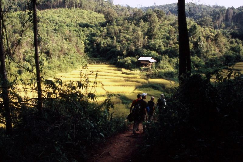 Kurz nach dem Wasserfall kommen wir aus dem Wald und vor uns liegen schon die ersten Reisfelder, wir müssen schon nah am Dorf sein.