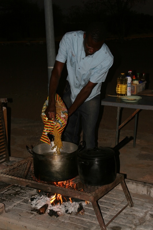 Es geht schneller und einfacher als befürchtet. Kaum haben wir uns häuslich eingerichtet geht auch schon die Sonne unter und unser Koch Eddie macht sich mit Hilfe des heutigen Küchenteams an die Arbeit. Das erste Essen ist das Probeessen, damit Eddie einschätzen kann, wie groß unser Hunger und Appetit ungefähr ist. Heute gibt’s ganz "Afrika-Typisch" Makkaroni.
