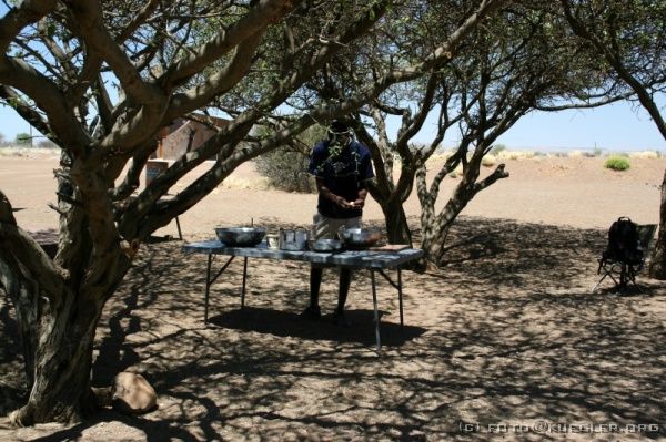 Am Truck hat Eddie inzwischen das Mittagessen fertig: Nudelsalat, Brot und Bananen.