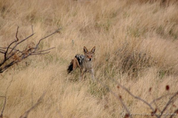 Und so fahren wir mit unserem Truck über die Schotterpisten auf der Suche nach Tieren. Wir sehen Zebras, Gnus und unzählige Springböcke, ab und zu auch Oryxantilopen und Schakale. Giraffen machen sich schon eher rar. Vergeblich halten wir Ausschau nach großen Tieren.