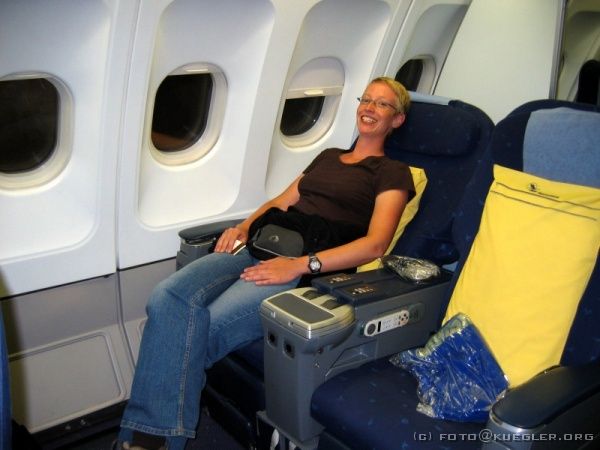 Wie die Schneekönige freuen wir uns über die Beinfreiheit, die verstellbaren breiten Sessel und genießen diesen luxuriösen Rückflug als einen krönenden Abschluss einer rundum gelungenen Reise.